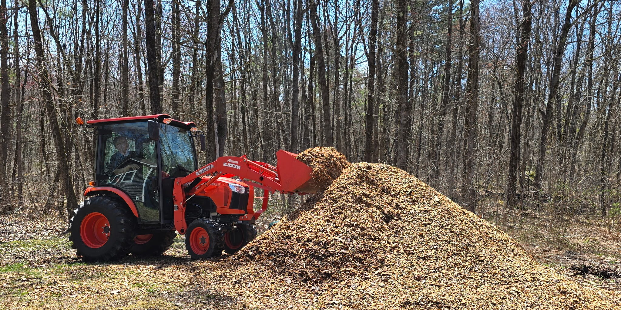 Beyond winter work, Karma Yāna supports many aspects of caring for the land throughout the year. Its bucket is used to move sand, soil, mulch, and wood chips for the gardens and grounds, and to lift and place large stones for rock walls and landscaping. With fork attachments, it can carry logs and brush, supporting ongoing maintenance and stewardship of our campus.